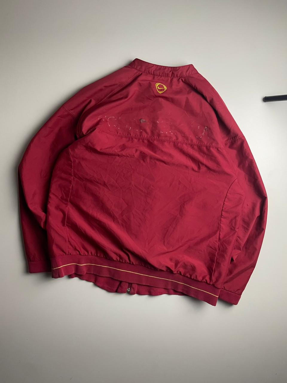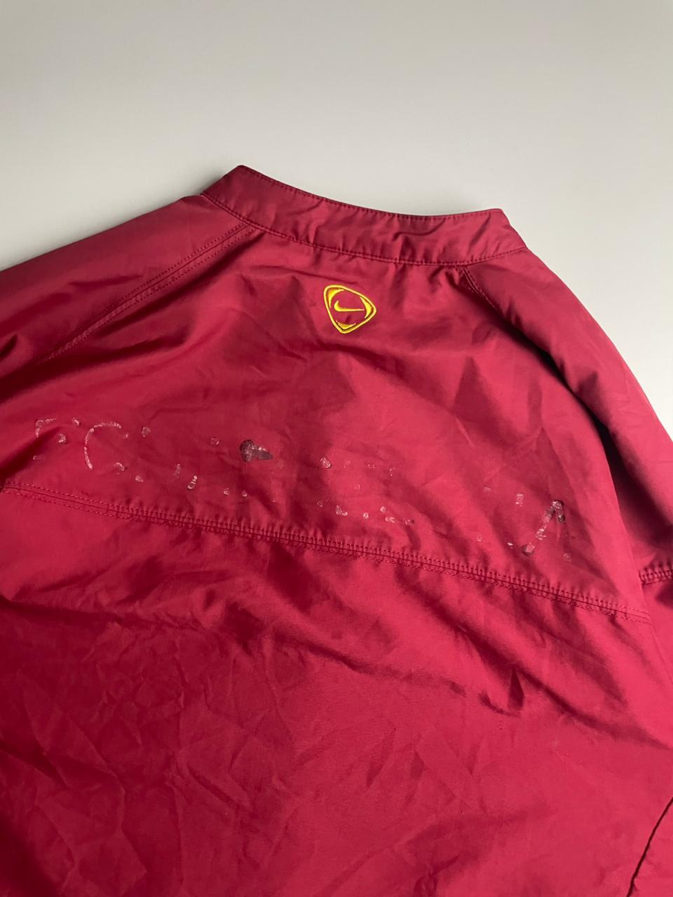 Jaqueta original da linha Nike Total 90, modelo do FC Barcelona, em um tom vinho marcante com detalhes em amarelo. Possui escudo bordado do Barça no peito e logo Nike em destaque, trazendo um visual esportivo clássico dos anos 2000.