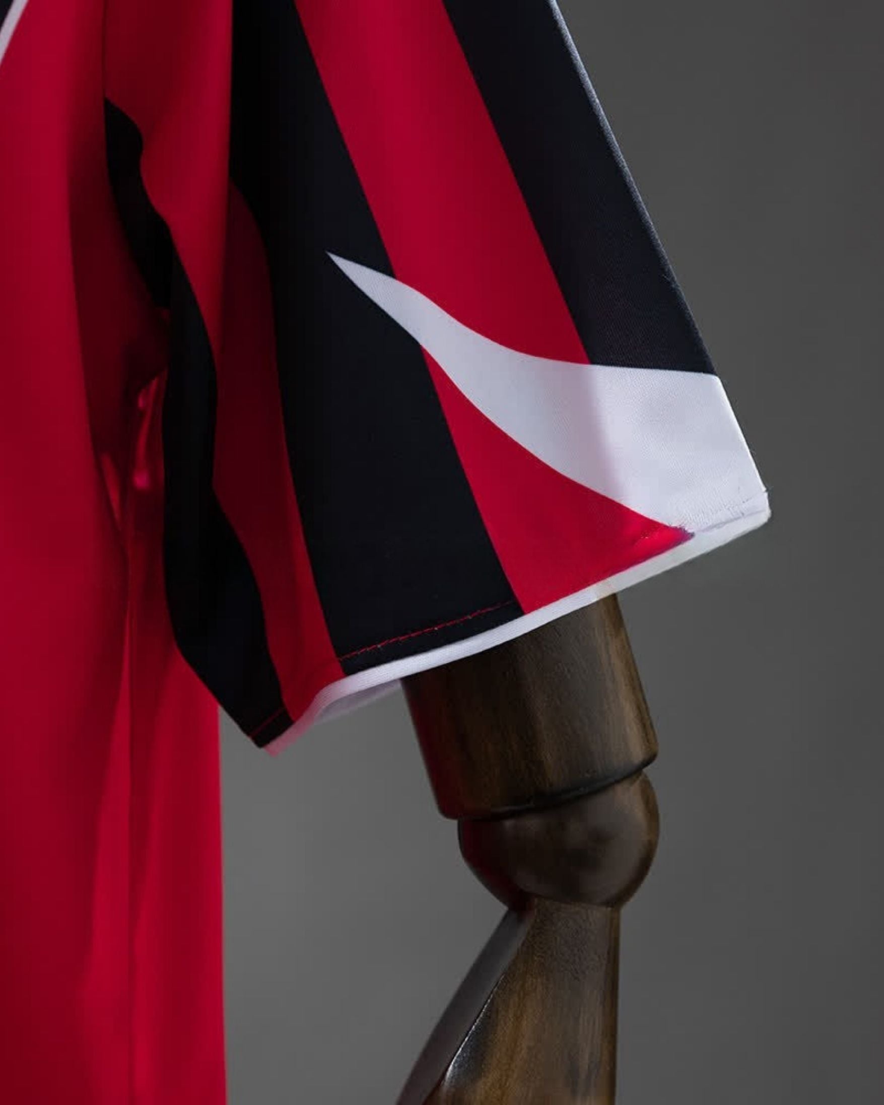 O modelo apresenta listras verticais em vermelho e preto, com detalhes em branco aplicados na gola e mangas, criando um contraste marcante e atemporal, muito característico da estética Total 90.