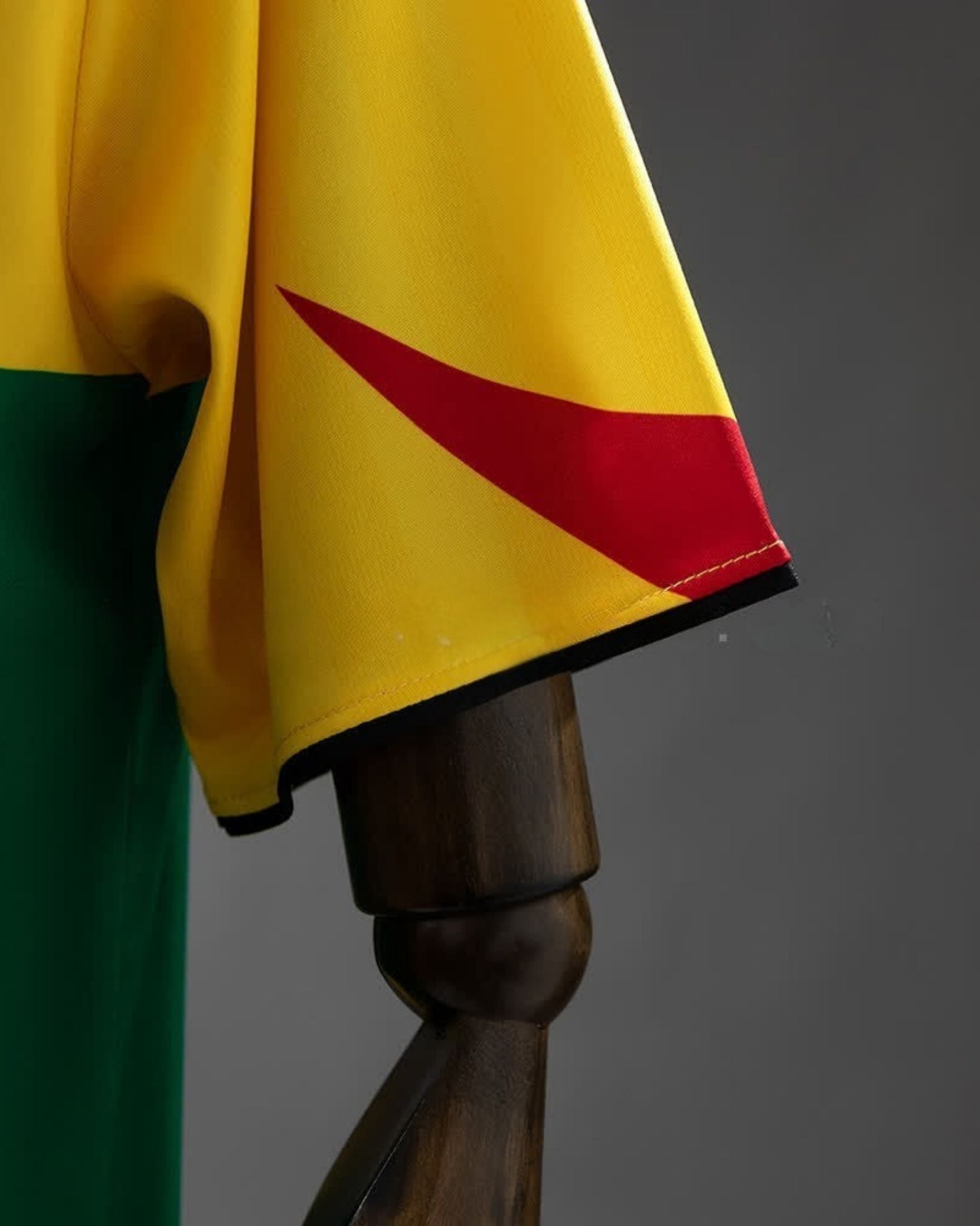 O modelo apresenta cor base amarela, com detalhes em verde, preto e vermelho aplicados na gola, laterais e mangas, criando um contraste forte e muito característico da estética Total 90.