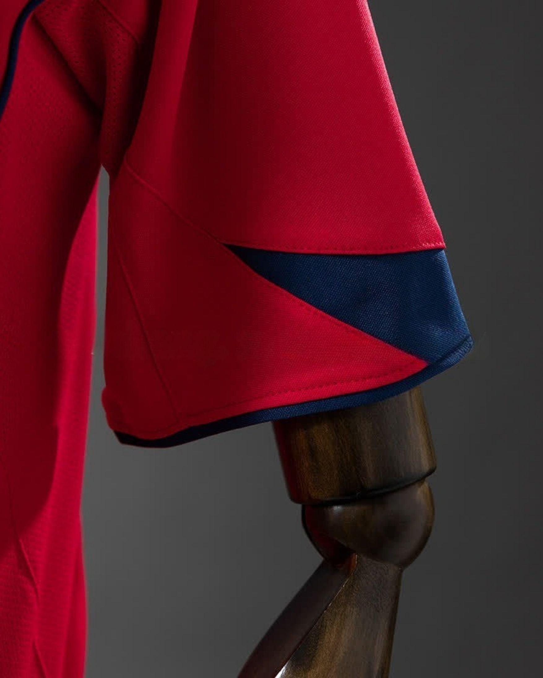 Predominantemente vermelha com uma faixa vertical azul marinho e detalhes brancos