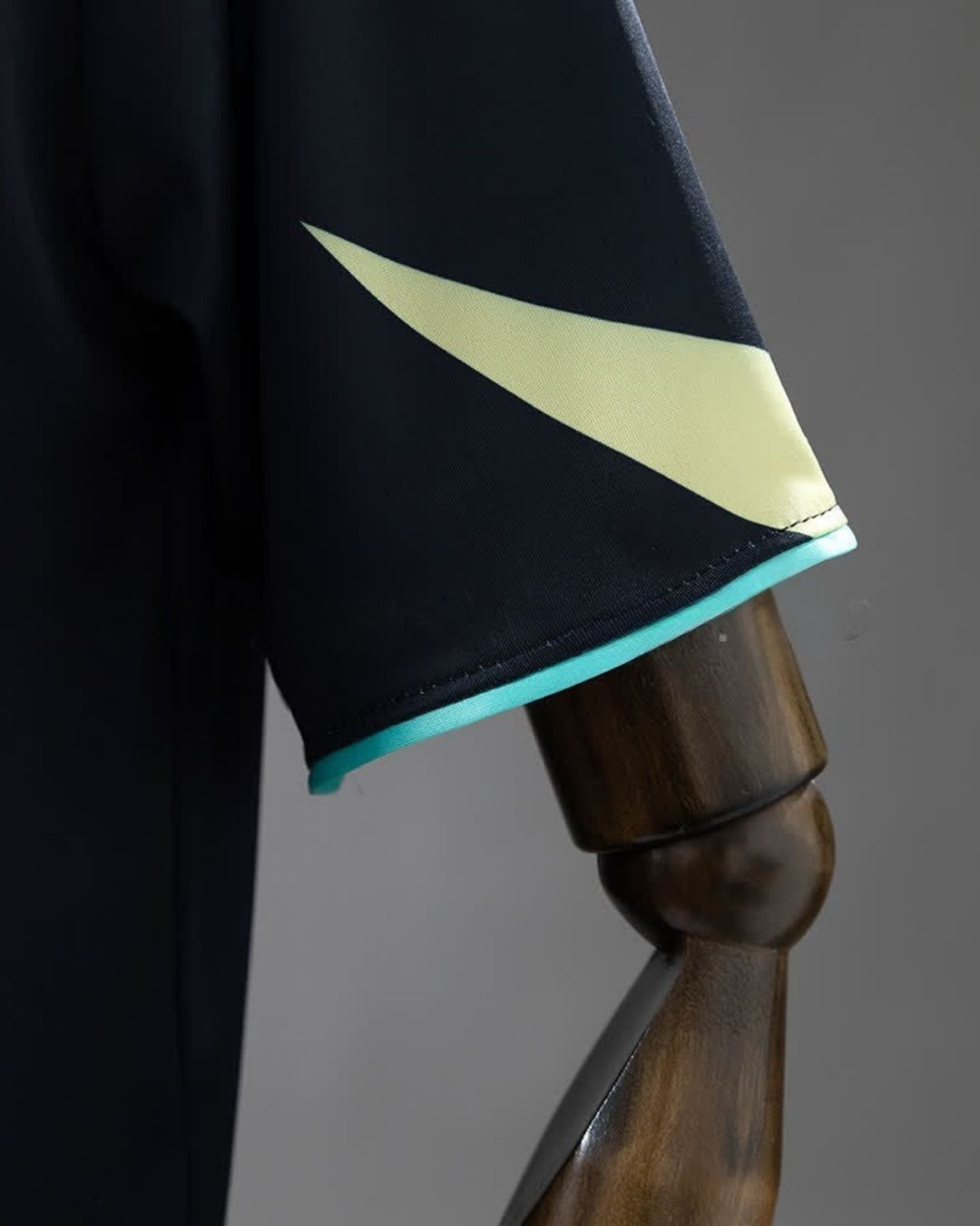 Gola em V com acabamento em azul-claro e detalhe interno em amarelo